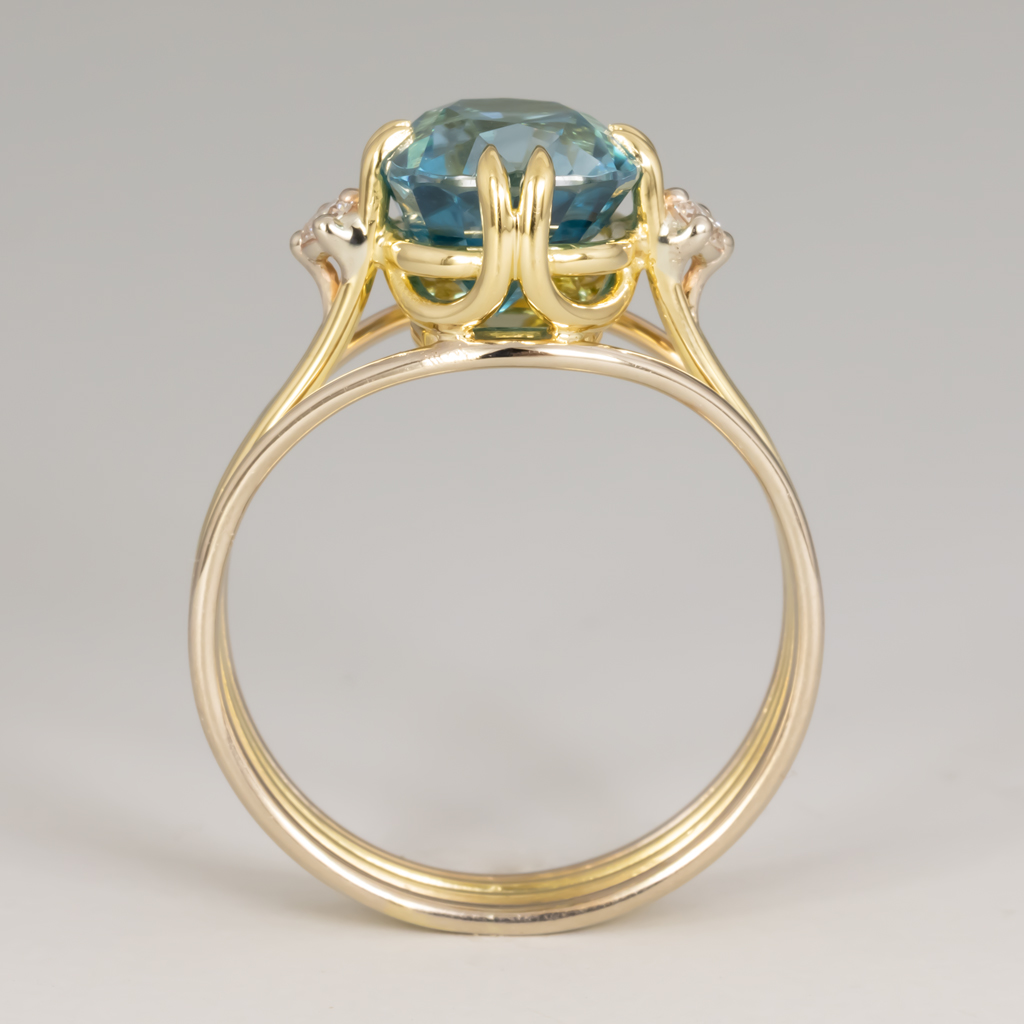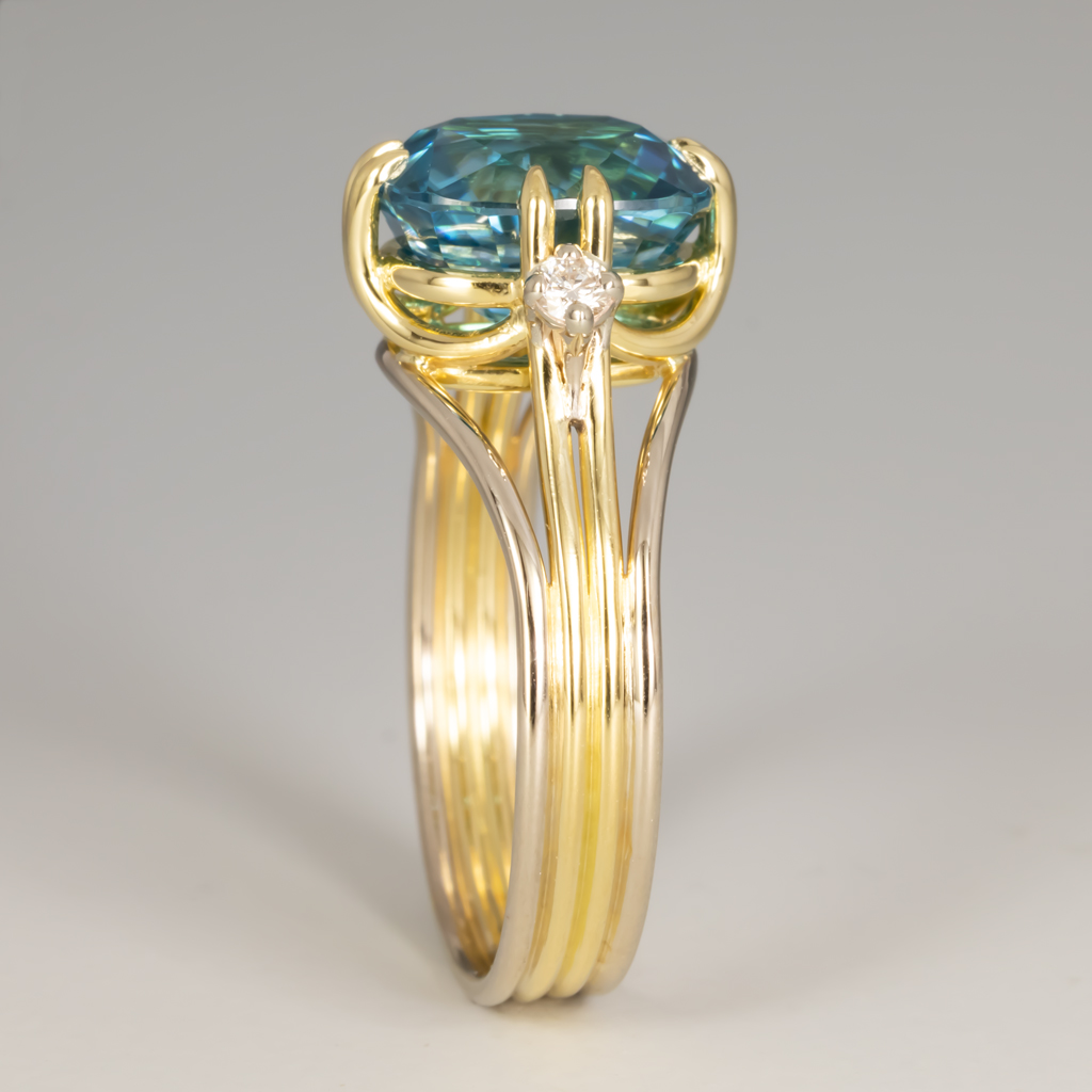 Four thin wires lay flat together while the prongs grow organically from the resting tendrils to securely cradle the beautiful Zircon stone.