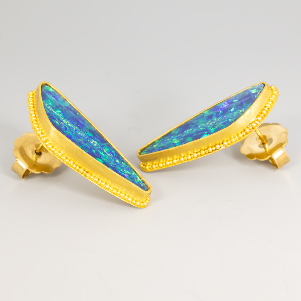 These beautiful post earrings by Evy feature Opals framed by the ancient Etruscan technique of Granulation.