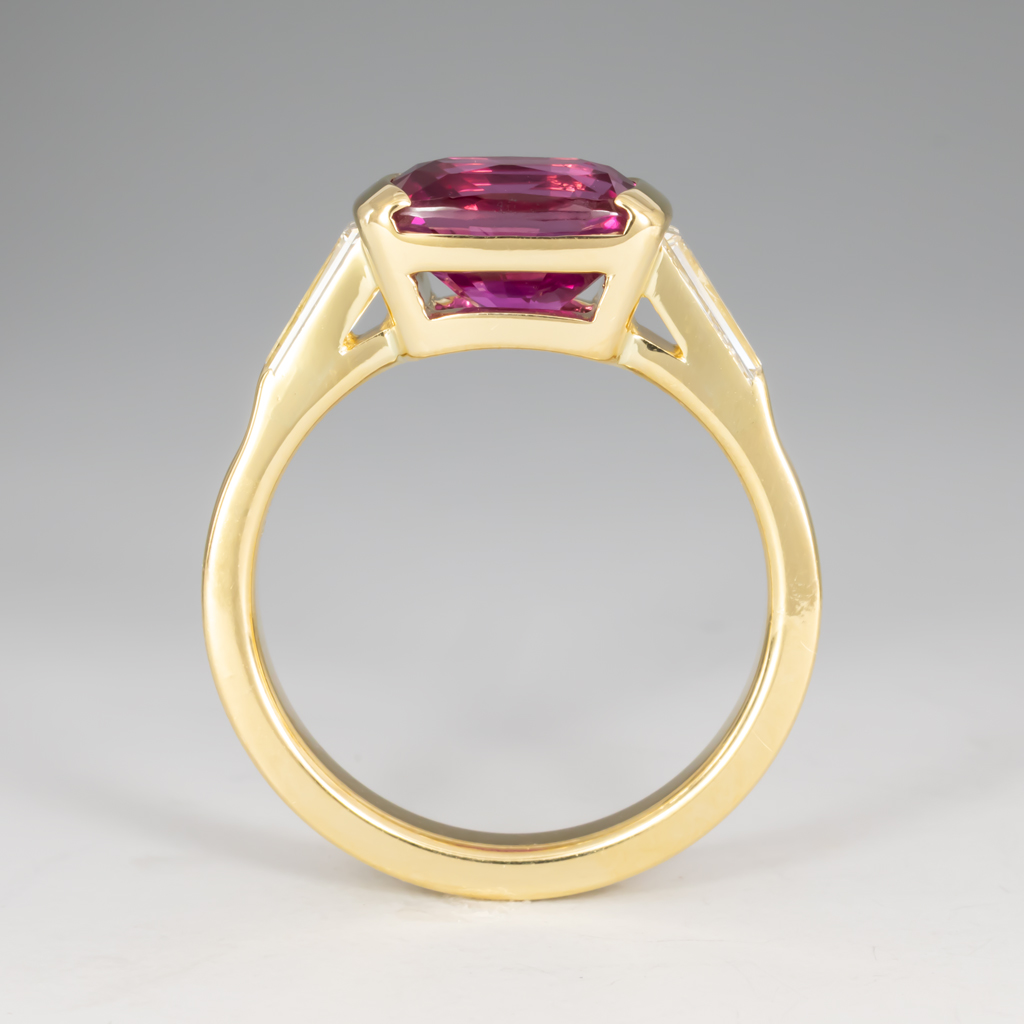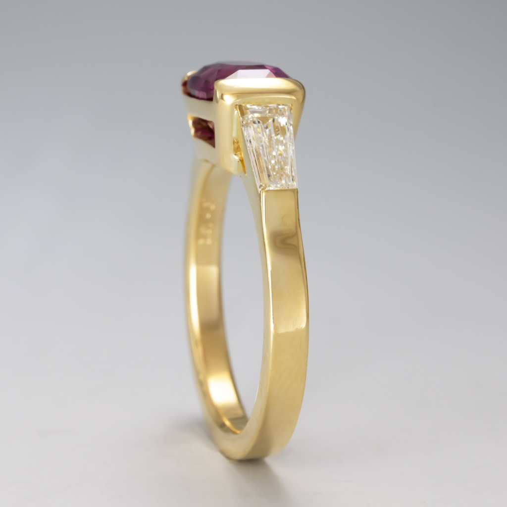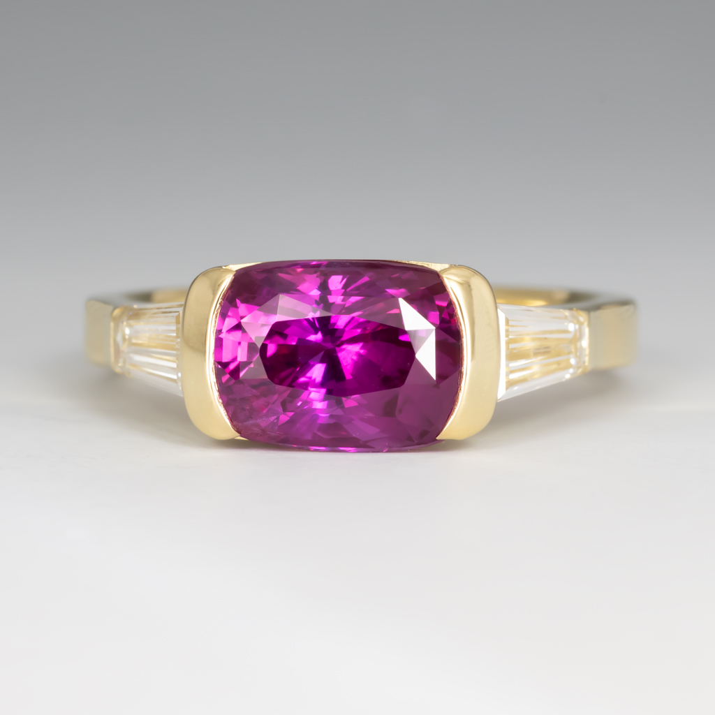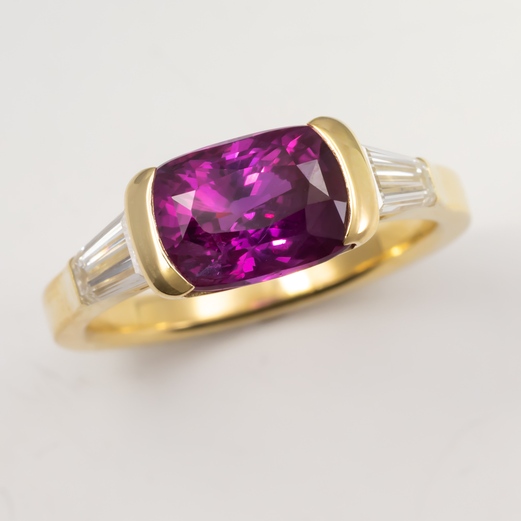 Boysenberry Sapphire Cushion 2.56ct. 8.69 x 6.06mm. >Diamond Tapered Baguettes .64ctw 5.85 x 3.18 x 2.15mm F VS1,