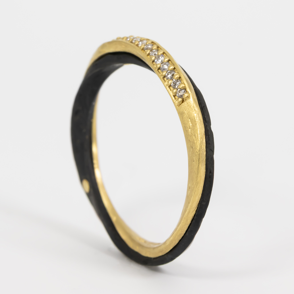 The ring has 0.11 ctw white diamonds set in 18KY gold and oxidized cobalt chrome.