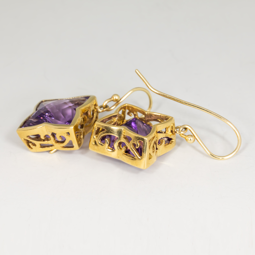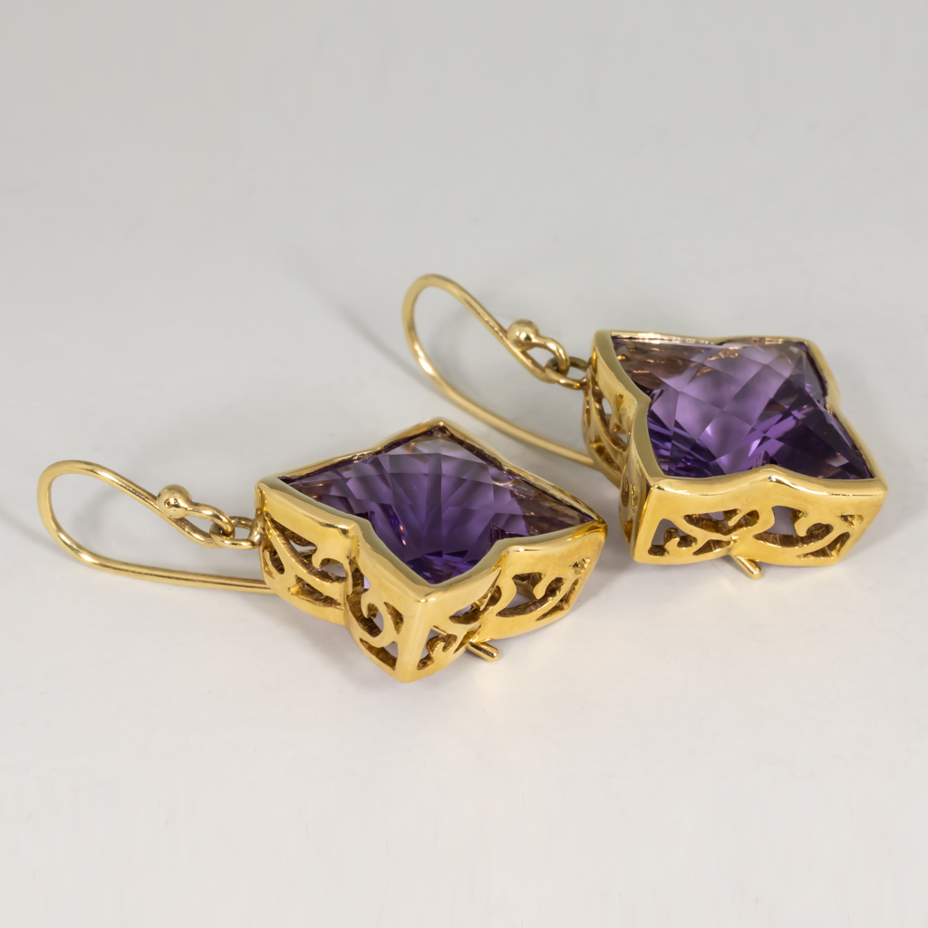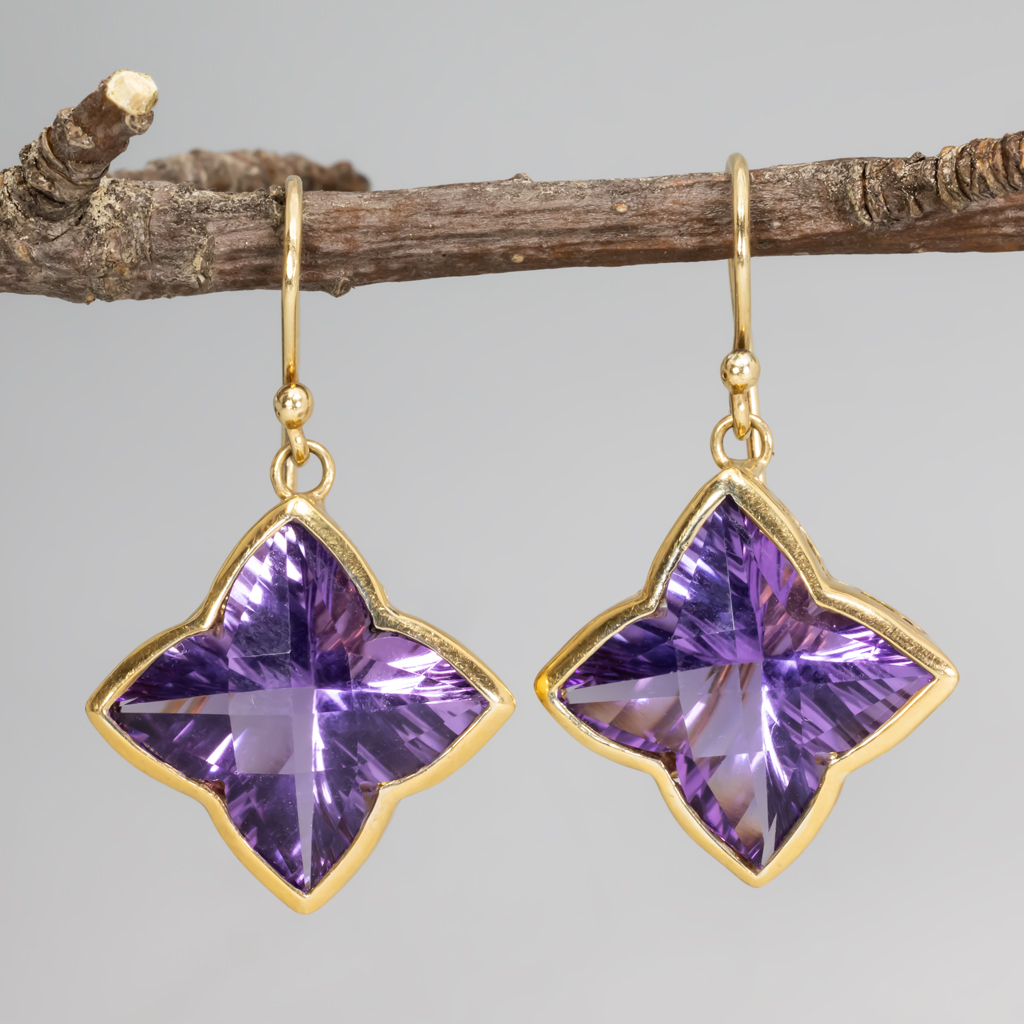 Amethysts like you have never seen them, in a four-petal flower design, framed by delicate lacy gold.
