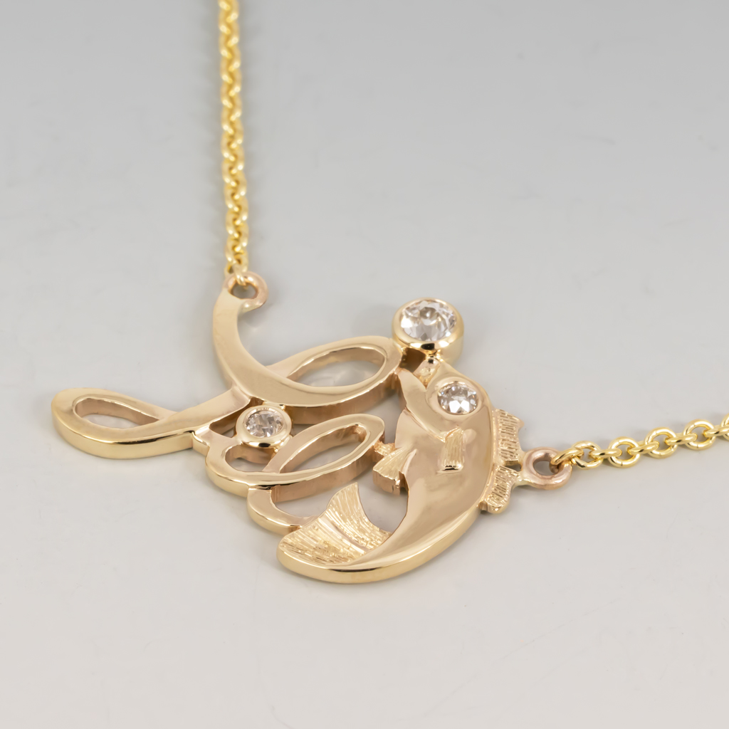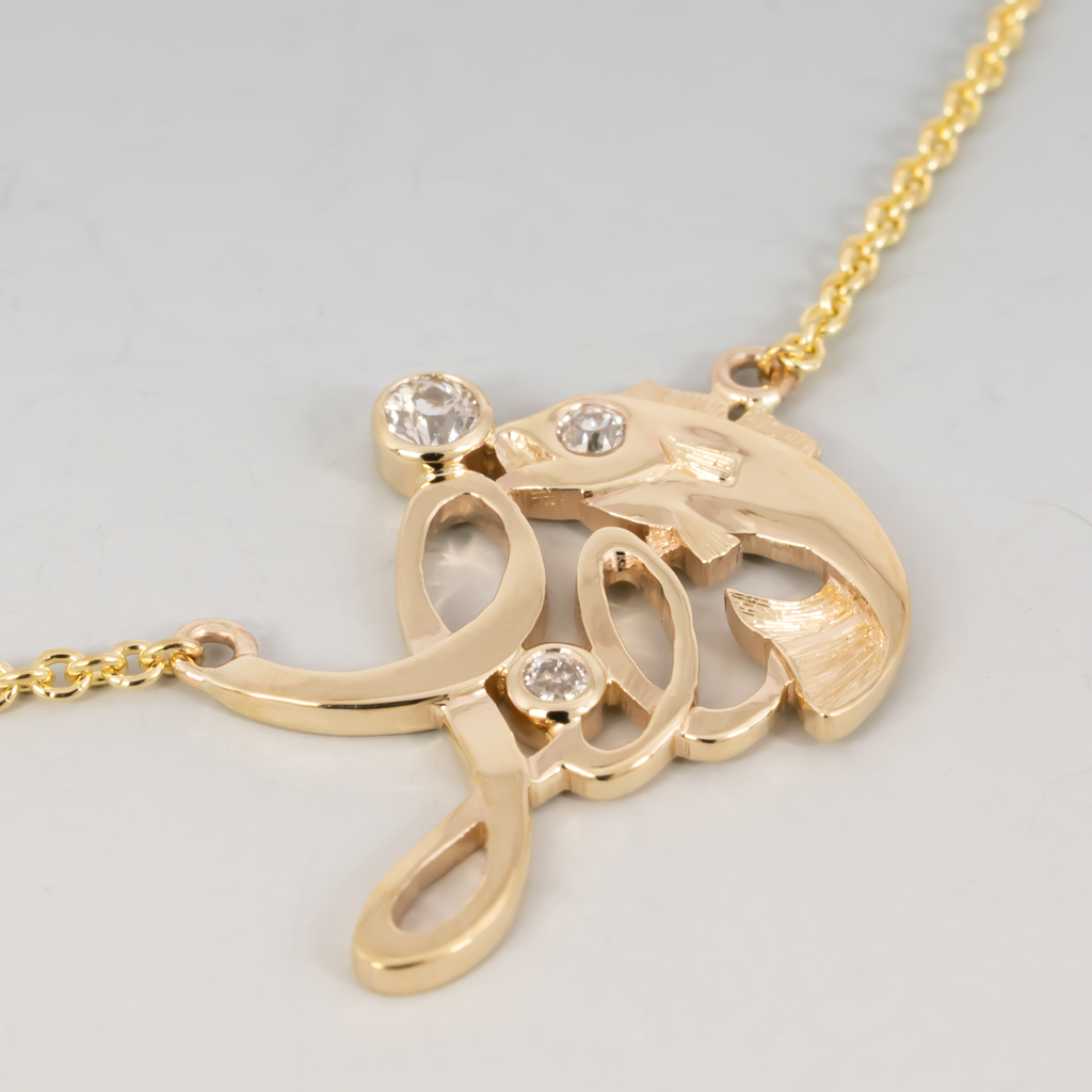 Li’l Fish 14KY Necklace with 3 diamonds on 1.3mm cable chain