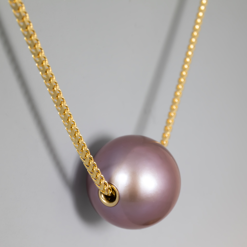 A simple pendant, turned sideways: to make a slide, drill a hole through a pearl and insert a sleeve for the chain.