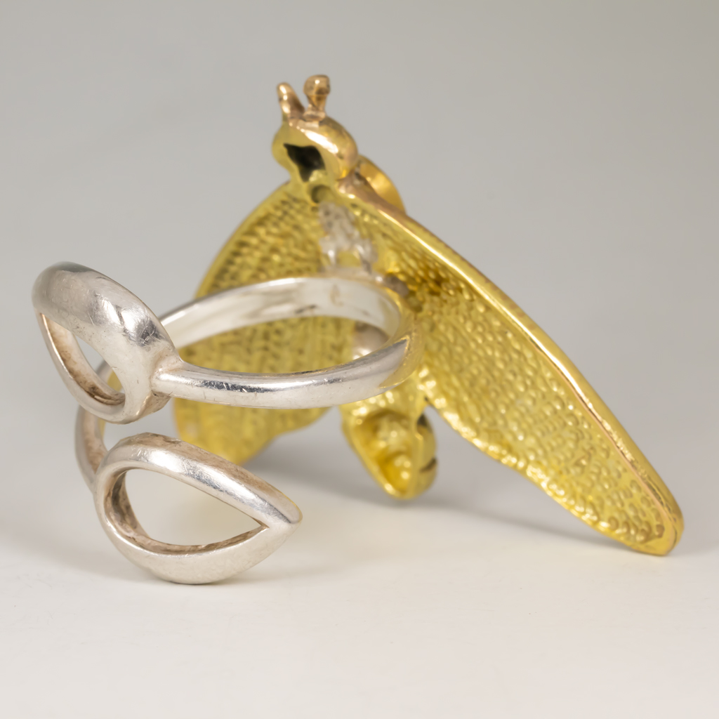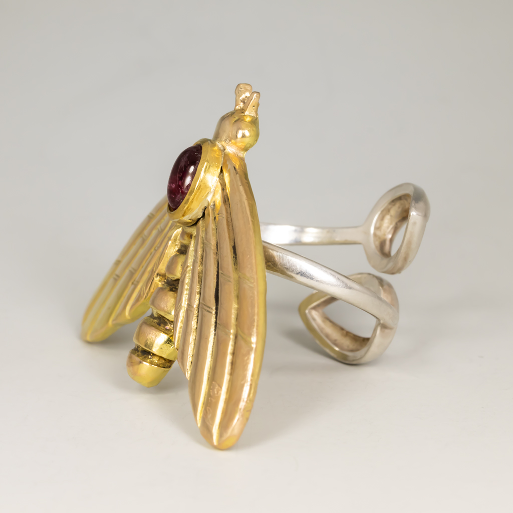 A sweet 14K gold Bee with Tourmaline thorax and sterling silver adjustable shank.