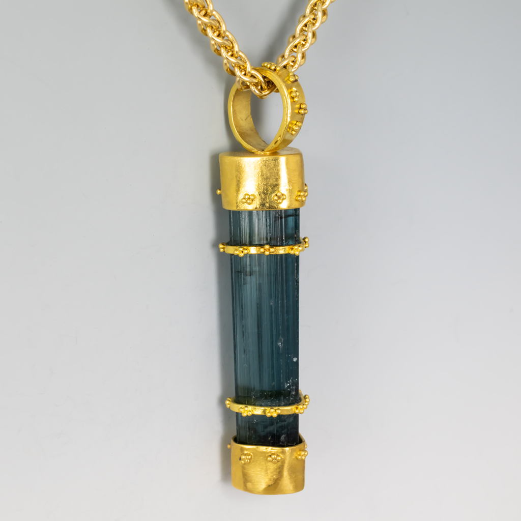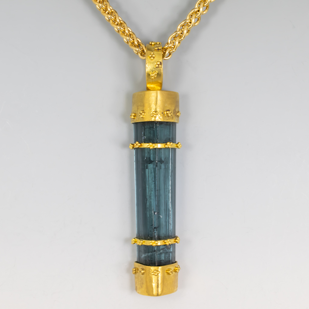 22K Granulation decorates a blue-green Tourmaline bar with heart-shaped cross section